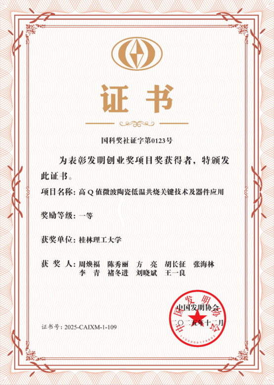 近日,2025年度中国发明协会发明创业奖项目奖评选结果揭晓,重点实验室周焕福教授团队科技成果“高Q值微波陶瓷低温共烧关键技术及器件应用”荣获一等奖。