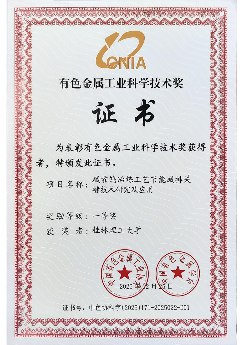 近日,中国有色金属工业协会和中国有色金属学会公布了2025年中国有色金属工业科学技术奖获奖名单,重点实验室李义兵、张伟光、梁军等牵头,广西平桂飞碟钨业有限公司参与完成的碱煮钨冶炼工艺节能减排关键技术研究及应用项目获评一等奖,这一荣誉是行业对我校在金属钨冶炼领域科技创新成果的高度认可。